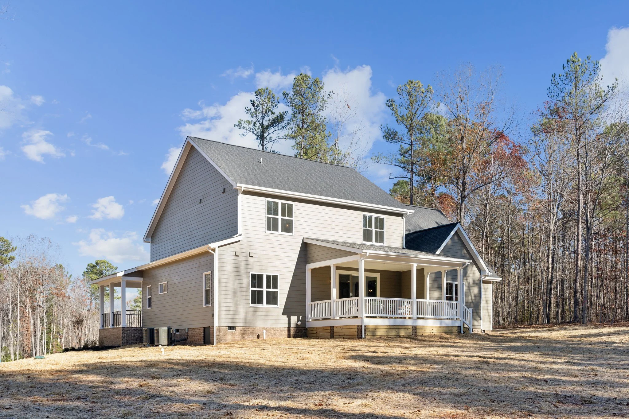 The dining area, bathed in natural light, offers a welcoming space for family meals and gatherings. From here, access the covered porch, perfect for enjoying outdoor dining and relaxation, extending your living space into the fresh air. The first floor also includes a luxurious primary bedroom suite, complete with a spacious walk-in closet and an en-suite bathroom. This private retreat offers a spa-like experience with modern fixtures and ample space for relaxation.