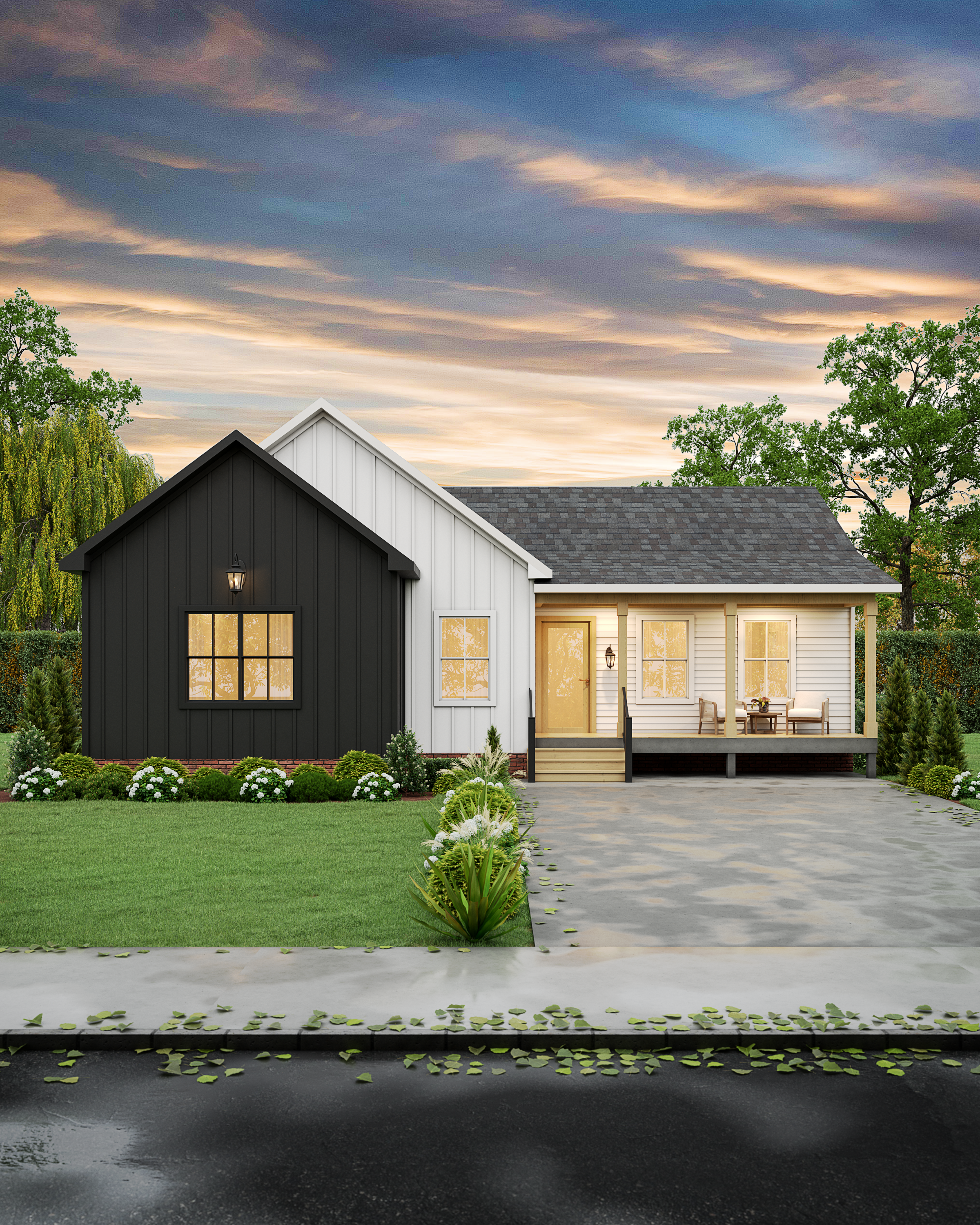 Outdoor living includes a front porch with space for seating and optional back deck